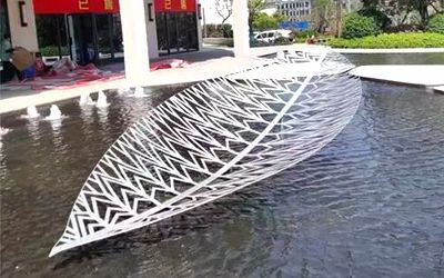酒店不銹鋼雕塑以美為主,一般為裝飾性美陳景觀雕塑,常見于酒店大門、大堂、園林。包括但不限于水景景觀類,如圓環、噴泉、鏤空球;裝飾美陳類,如蓮花、翅膀、鵝卵石、水滴等。